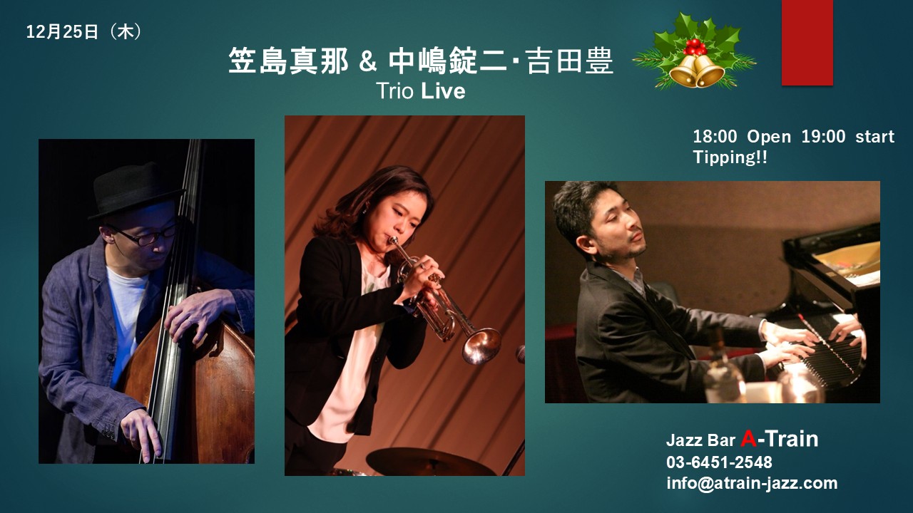| 25日 | 木 | 19:00-21:30 | Trio Live | Trumpet:笠島真那 Piano:中嶋錠二 Bass:吉田豊 |